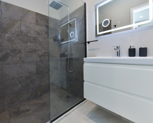 • Tiled bathrooms with floor-to-ceiling ceramic finishes